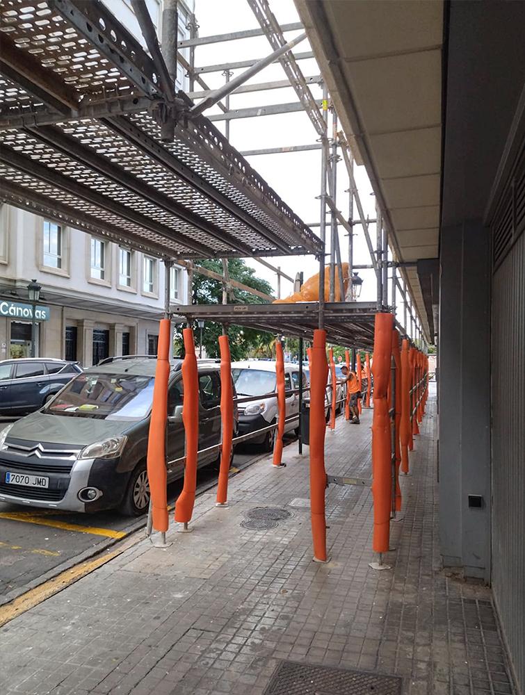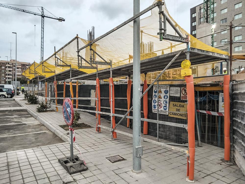 En Sarbel tenemos capacidad para montar todo tipo de marquesina de protección, desde pasos peatonales en la vía pública, a marquesinas voladas entre forjados de obra, que permitan realizar trabajos de ejecución de fachada en los forjados inferiores, al tiempo que se continua ejecutando la estructura del edifico.